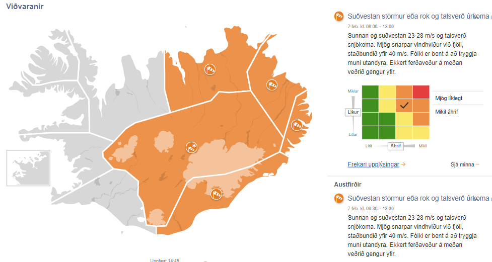 "Sunnan og suðvestan 23-28 m/s og talsverð snjókoma. Mjög snarpar vindhviður við fjöll, staðbundið yfir 40 m/s. Fólki er bent á að tryggja muni utandyra. Ekkert ferðaveður á meðan veðrið gengur yfir."