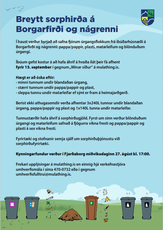 Í haust verður byrjað að safna fjórum úrgangsflokkum frá íbúðarhúsnæði á Borgarfirði og nágrenni: pappa/pappír, plasti, matarleifum og blönduðum úrgangi. Með þessu verður sama sorphirðukerfi komið á frá öllum heimilum í sveitarfélaginu.
