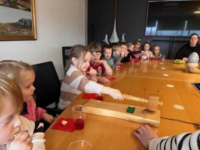 Þá sagði Dagmar þeim frá hamrinum sem er í fundarsalnum, að hann væri eftir Hlyn á Miðhúsum og að forseti sveitarstjórnar notaði hamarinn til þess að setja og slíta fundi. Það mætti þó alls ekki nota hann til að hengja neitt upp á veggi. Hamarinn var svo látinn ganga og fengu krakkarnir allir að prófa gripinn.