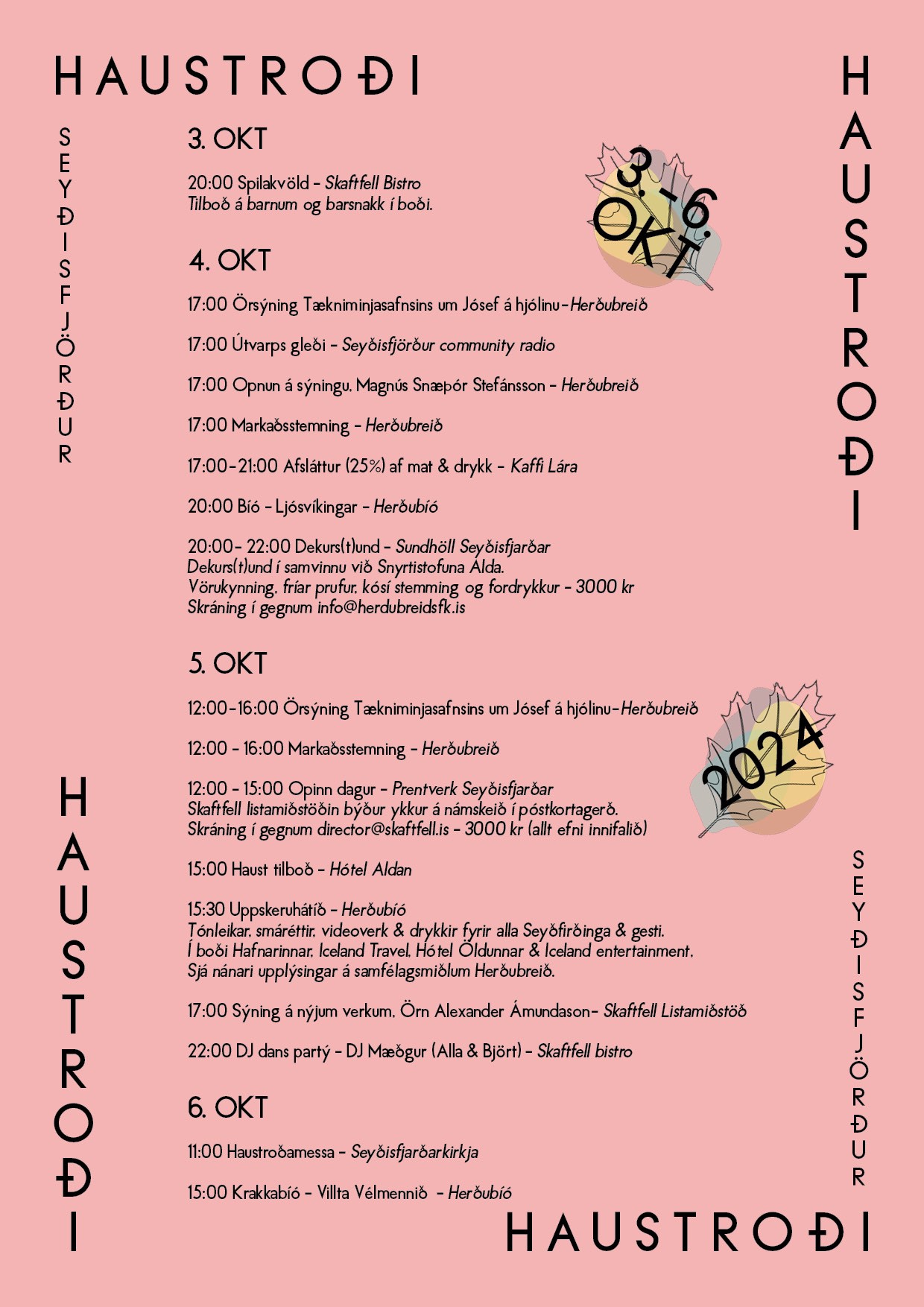 Gleðin hefst með spilakvöldi á Skaftfelli Bistro fimmtudaginn 3. október klukkan 20:00. Formleg opnun verður föstudaginn 4. október klukkan 17:00 og strax á slaginu hefjast fimm viðburðir sem áhugasamir geta kynnt sér og notið. Þar á meðal verður sérstök örsýning Tækniminjasafnsins um Jósef á hjólinu, sýning Magnúsar Snæþórs Stefánssonar opnar í Herðubreið og þar hefst líka opinn markaður á sama tíma.