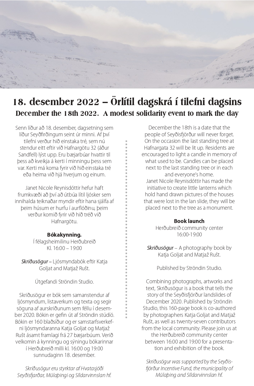 Viðburðurinn stendur yfir þann 18.desember og er fólki frjálst að koma hvenær sem er. Bókakynning verður haldin í félagsheimilinu Herðubreið frá kl 16:00 -19:00 á bókinni Skriðusögur eftir Katja Goljat og Matjaž Rušt. Vönduð ljósmyndabók sem gefur myndræna sýn á hinn örlagaríka dag og frásagnir bæjarbúa.