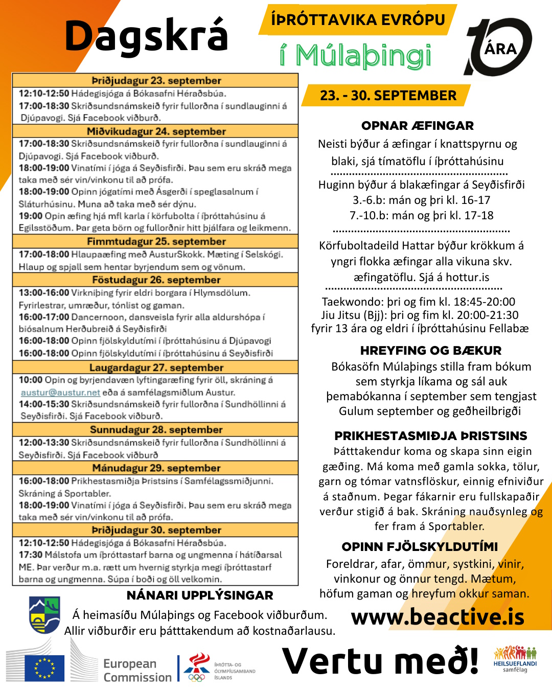 Þá er hin árlega Íþróttavika Evrópu hafin og er hún uppfull af fjölbreyttum og skemmtilegum viðburðum og eru íbúar á öllum aldri hvattir til að taka virkan þátt.