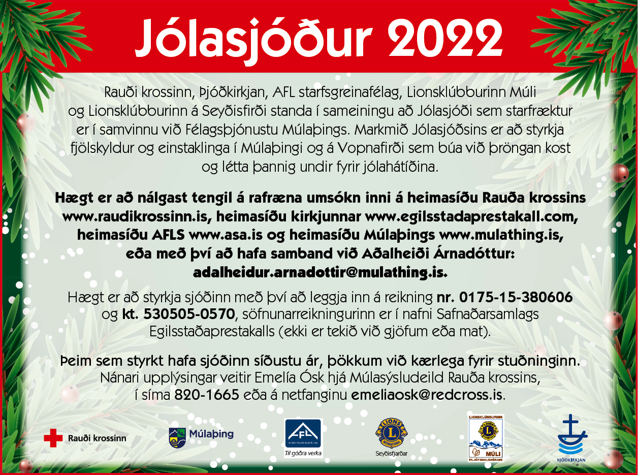 Rauði krossinn, Þjóðkirkjan, AFL starfsgreinafélag, Lionsklúbburinn Múli og Lionsklúbburinn á Seyðisfirði standa í sameiningu að jólasjóði sem starfræktur er í samvinnu við Félagsþjónustu Múlaþings. Markmið sjóðsins er að styrkja fjölskyldur og einstaklinga í Múlaþingi og á Vopnafirði sem búa við þröngan kost og létta þannig undir fyrir jólin.