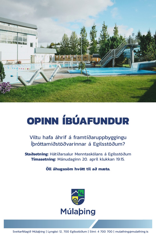 Opinn íbúafundur um framtíðaruppbyggingu Íþróttamiðstöðvarinnar á Egilsstöðum verður haldinn mánudaginn 20. apríl klukkan 19:15 í hátíðarsal Menntaskólans á Egilsstöðum.