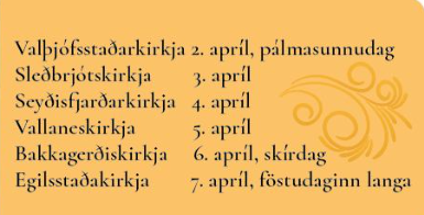 Í Bakkagerðiskirkju verða passíusálmar sungnir og lesnir á skýrdag kl 17:30 og páska-gospel messa á annan í páskum kl 14:00