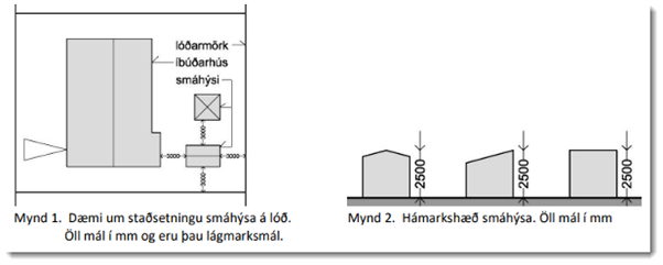 - Smáhýsi má vera allt að 15 m² og 2,5 m á hæð. Miða skal við brúttófermetrafjölda og hæð smáhýsisins skal mæld frá yfirborði jarðvegs og miðuð við hæsta punkt smáhýsisins, hvort sem það er útveggur eða þak.
