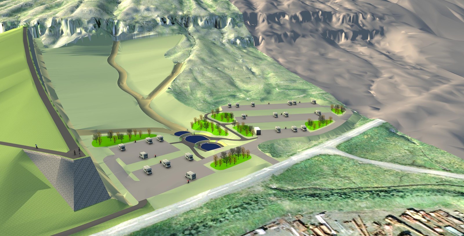Fyrsti hluti verksins er gerð nýs húsbílastæðis í stað þess eldra, sem mun verða aflagt þar sem það lendir að stórum hluta undir garði. Áætlað er að stór hluti húsbílastæðisins verði tilbúinn í maí 2022. Verktaki hefur jafnframt hafið vinnu í Skaganámu þar sem sækja þarf efni til verksins og hafið vinnu við gerð vinnuvegar frá Skaganámu að vinnusvæðinu svo hægt verði að halda þungaumferð vegna verkefnisins utan við götur bæjarins.