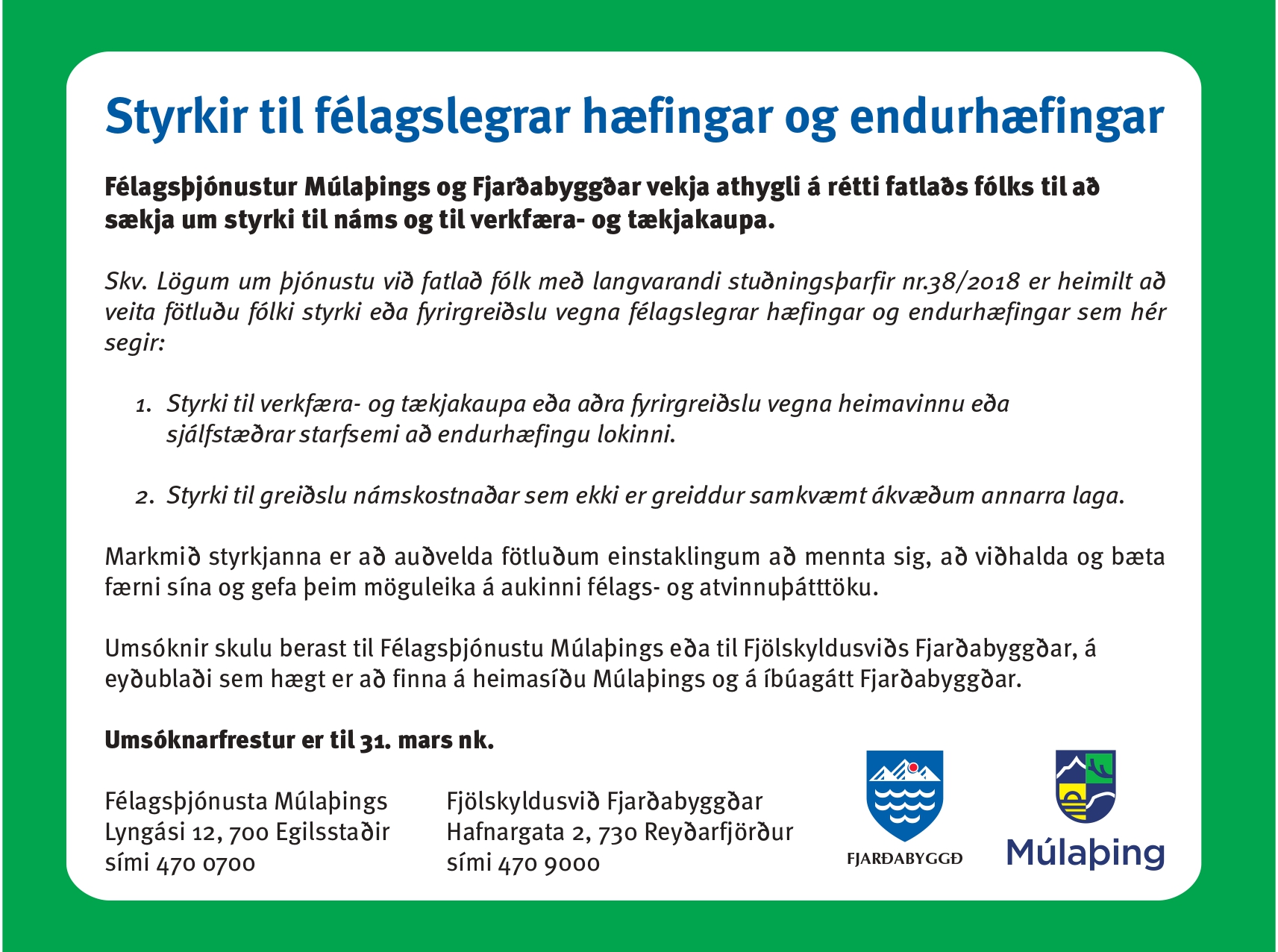 Múlaþing hvetur öll sem geta nýtt sér styrkinn að sækja um fyrir 31.mars næstkomandi.