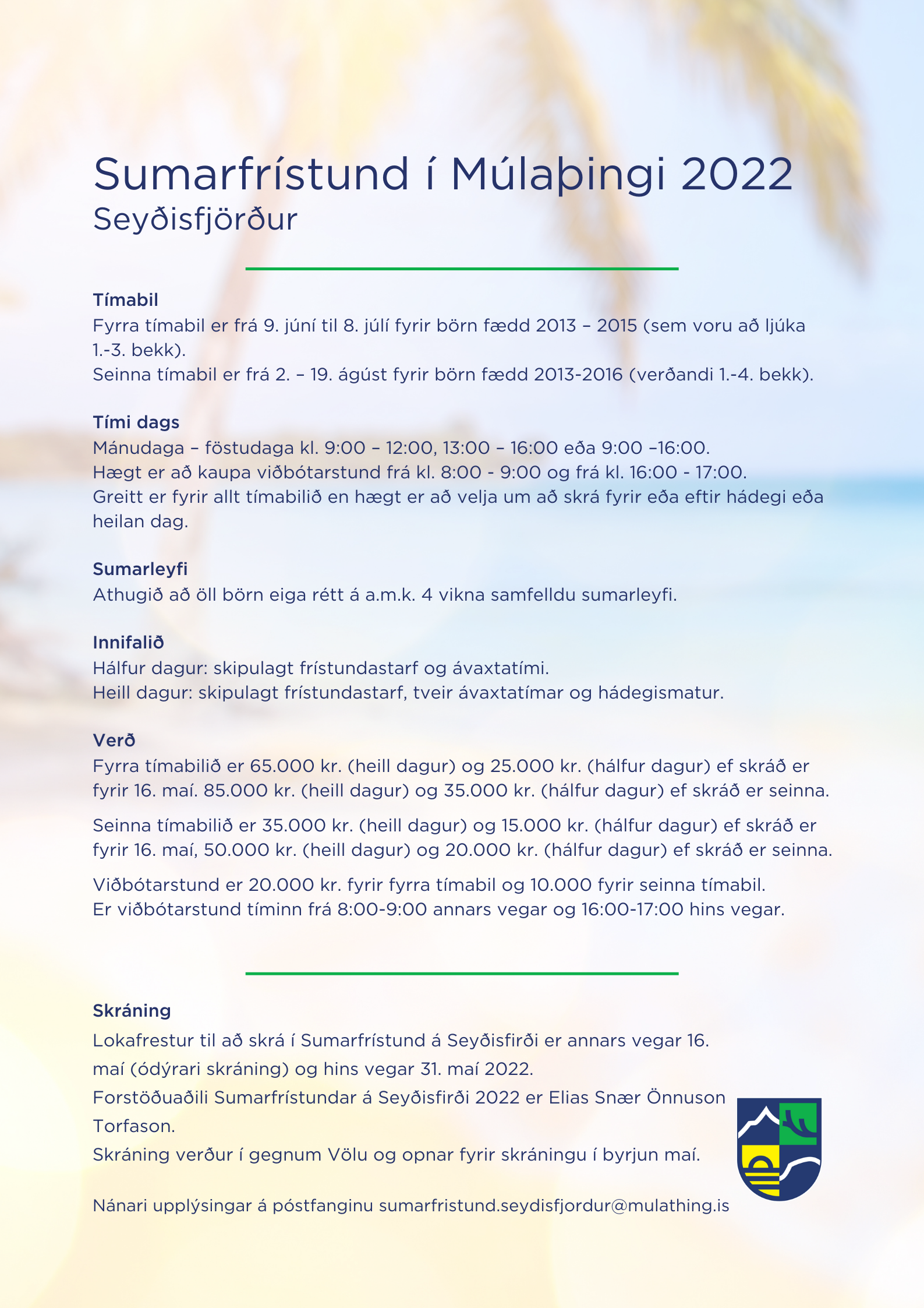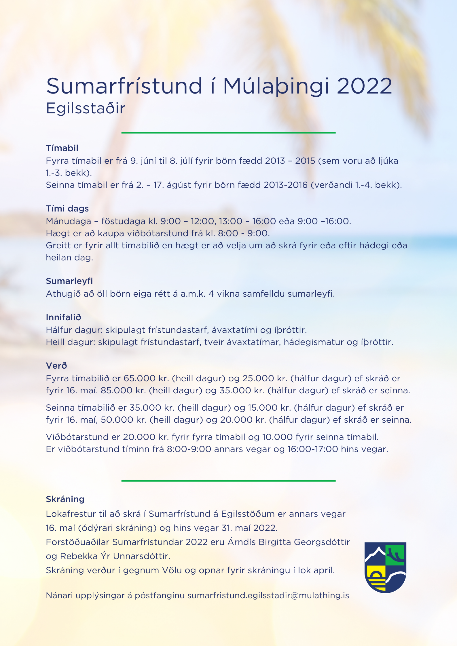 Nánari upplýsingar á póstfanginu sumarfristund.egilsstadir@mulathing.is og sumarfristund.seydisfjordur@mulathing.is.