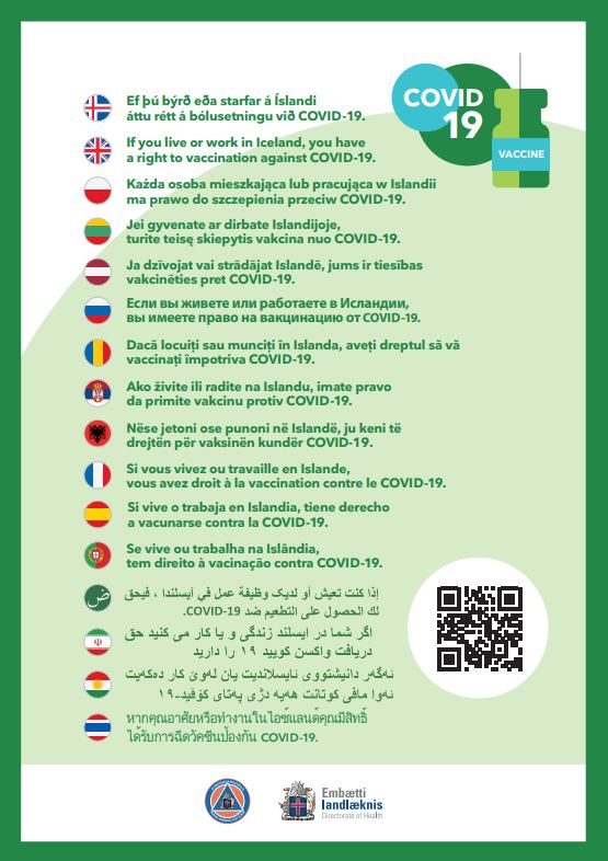 If you live or work in Iceland, you have a right to vaccination against COVID-19. You can register for a vaccination and get more information by sending an email to bolusetning@hsa.is