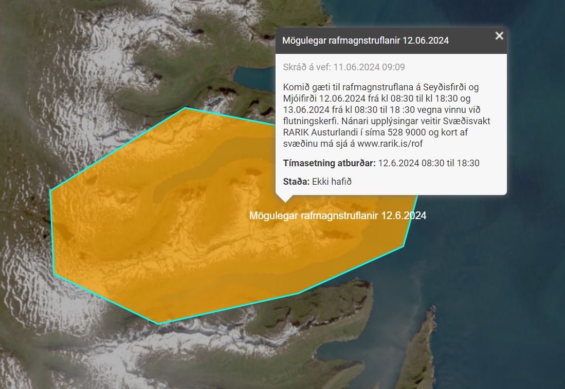 Komið gæti til rafmagnstruflana á Seyðisfirði og Mjóafirði 12.06.2024 frá klukkan 08:30 til 18:30 og 13.06.2024 frá klukkan 08:30 til 18:30 vegna vinnu við flutningskerfi. Nánari upplýsingar veitir Svæðisvakt RARIK Austurlandi í síma 528 9000 og kort af svæðinu má sjá á www.rarik.is/rof.