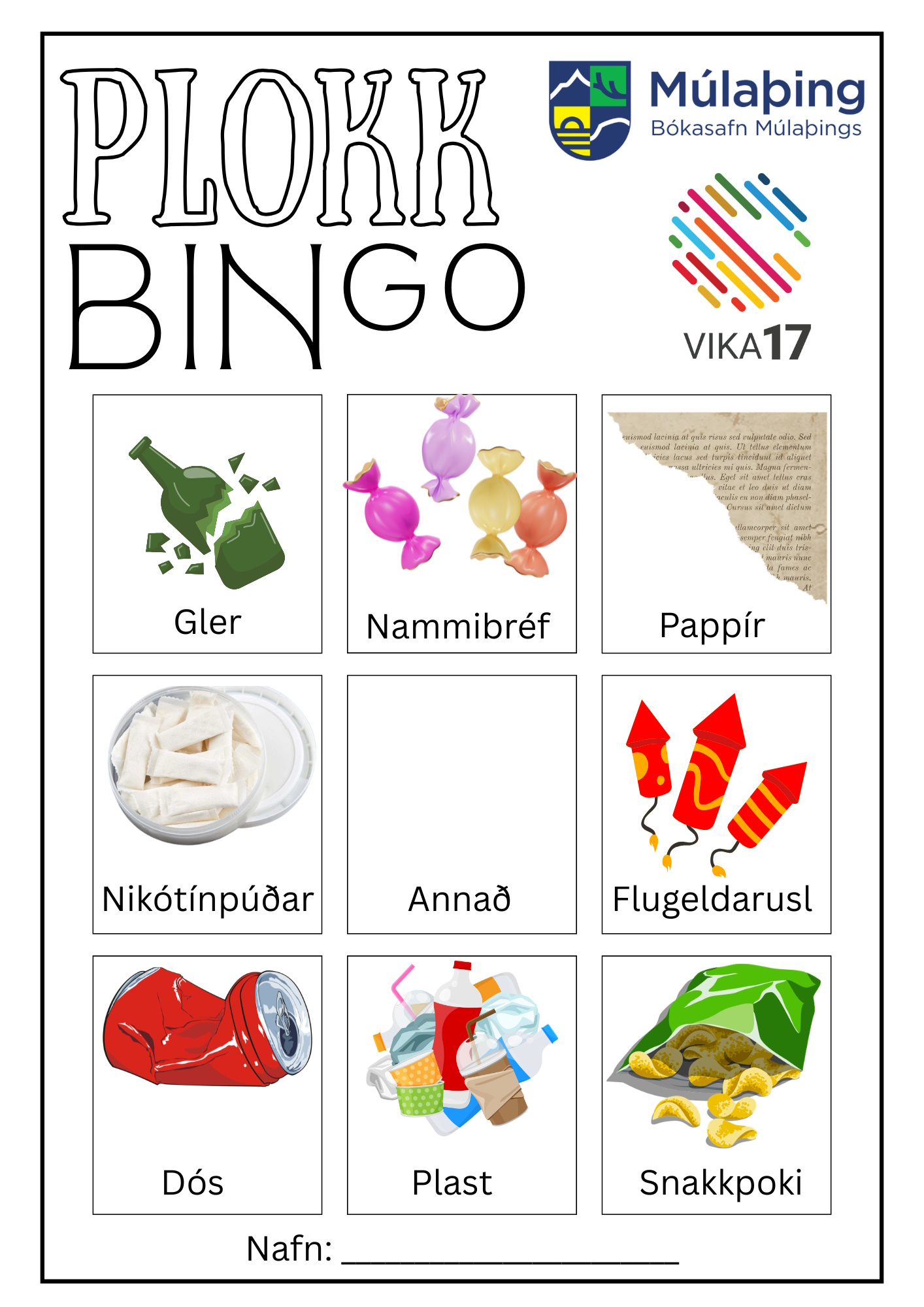 Á Bókasafni Múlaþings verður boðið upp á plokkbingó á öllum starfsstöðvum þess. Hægt er að koma á sitt safn og fá útprentað bingó eða styðjast við þetta sem er hér.