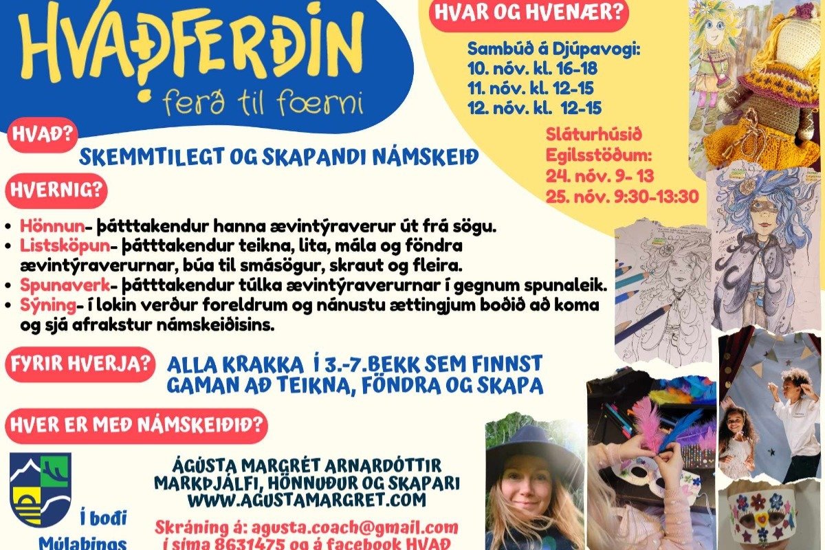 Hvaðferðin er skemmtilegt og skapandi námskeið sem stuðlar að því að veita börnum og unglingum tækifæri til þekkja og nýta hæfileika sína, hugmyndir, hugrekki og sköpunarkraft betur.