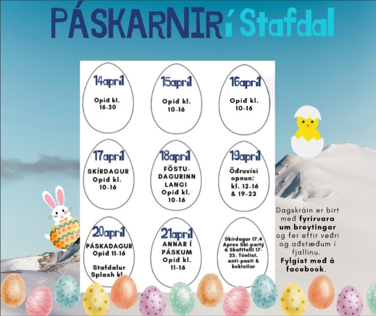 Nú er snjórinn mættur og það verður opið í Stafdal alla páskana (ef veður og færð leyfa) og ýmislegt um að vera.