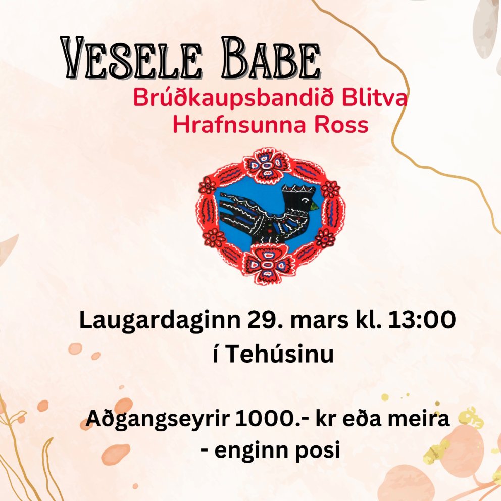 Kvennakórinn Vesele babe heldur tónleika í Tehúsinu á Egilsstöðum laugardaginn 29. mars kl. 13:00 og hefur sér til aðstoðar Brúðkaupsbandið Blitva og Hrafnsunnu Ross.